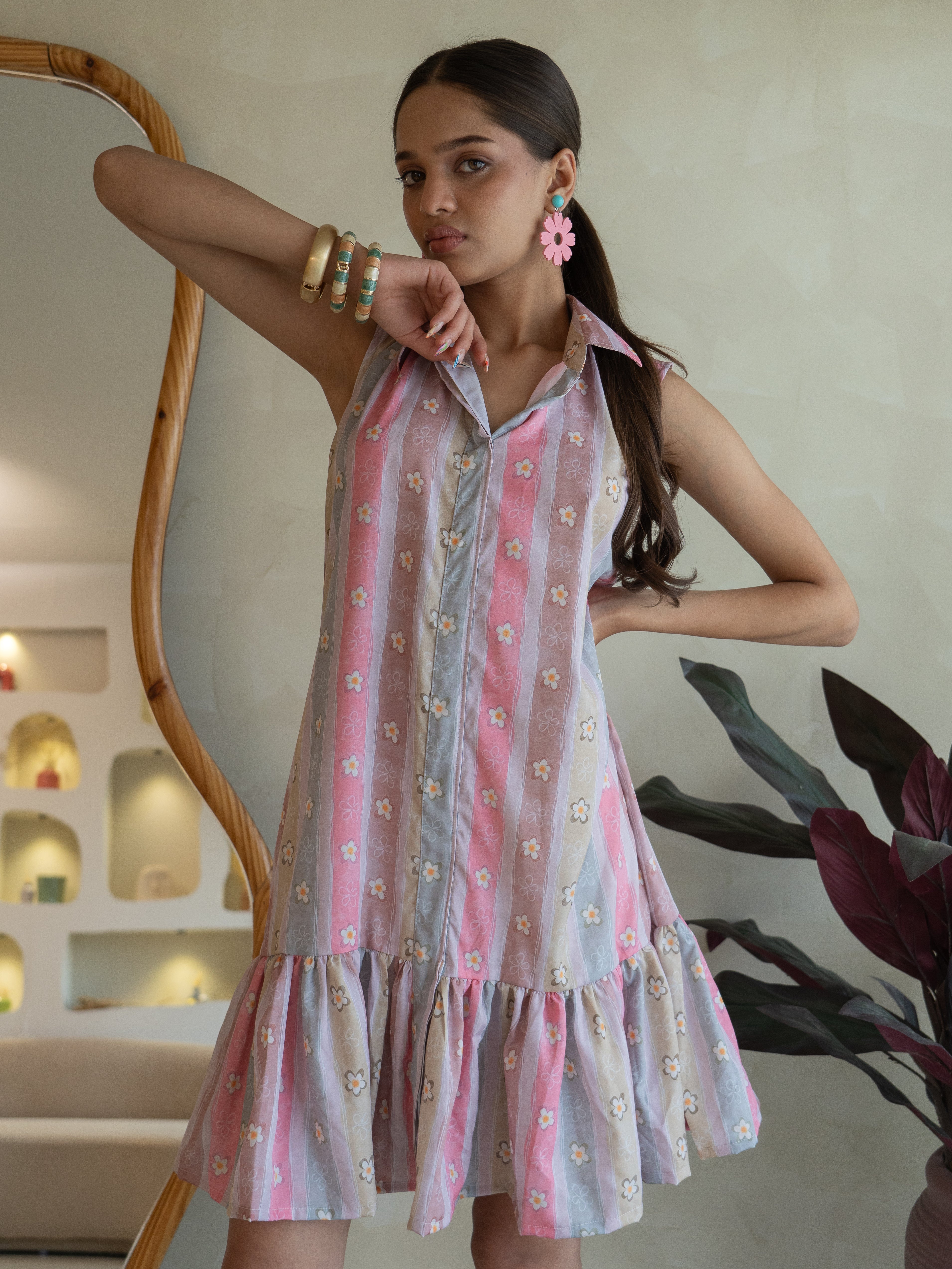Meet Daisy Stripes, a super cute sleeveless short dress with a playful collar and a soft, flowy silhouette. Designed in pink, brown, and beige stripes, sprinkled with the sweetest little daisies. Fun, fresh, and made to brighten your day!