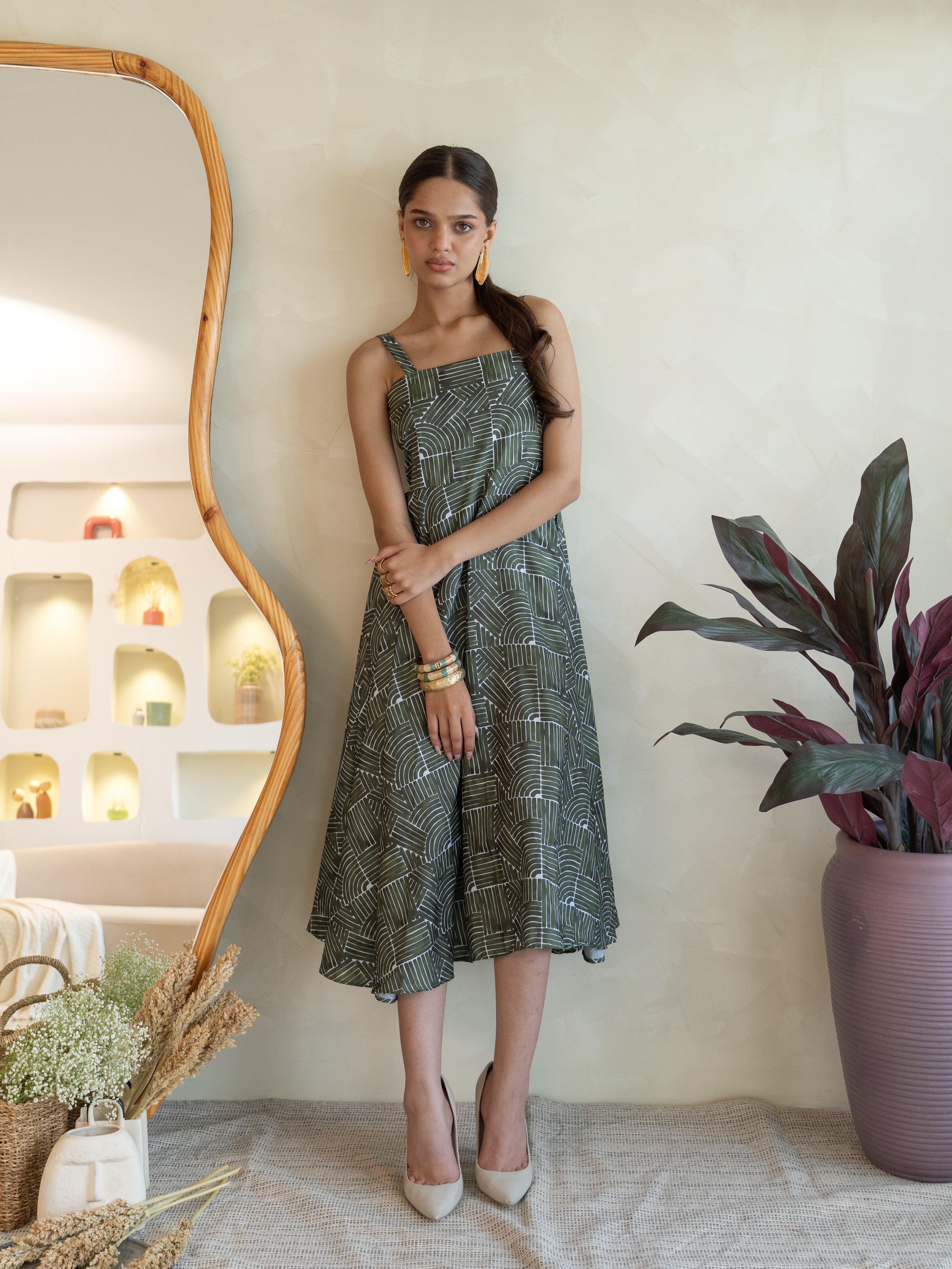 A breezy calf-length strappy dress with a flowy silhouette and vibrant green abstract print that screams tropical escape. Fresh, fun, and effortlessly stylish—like a vacation in dress form.
