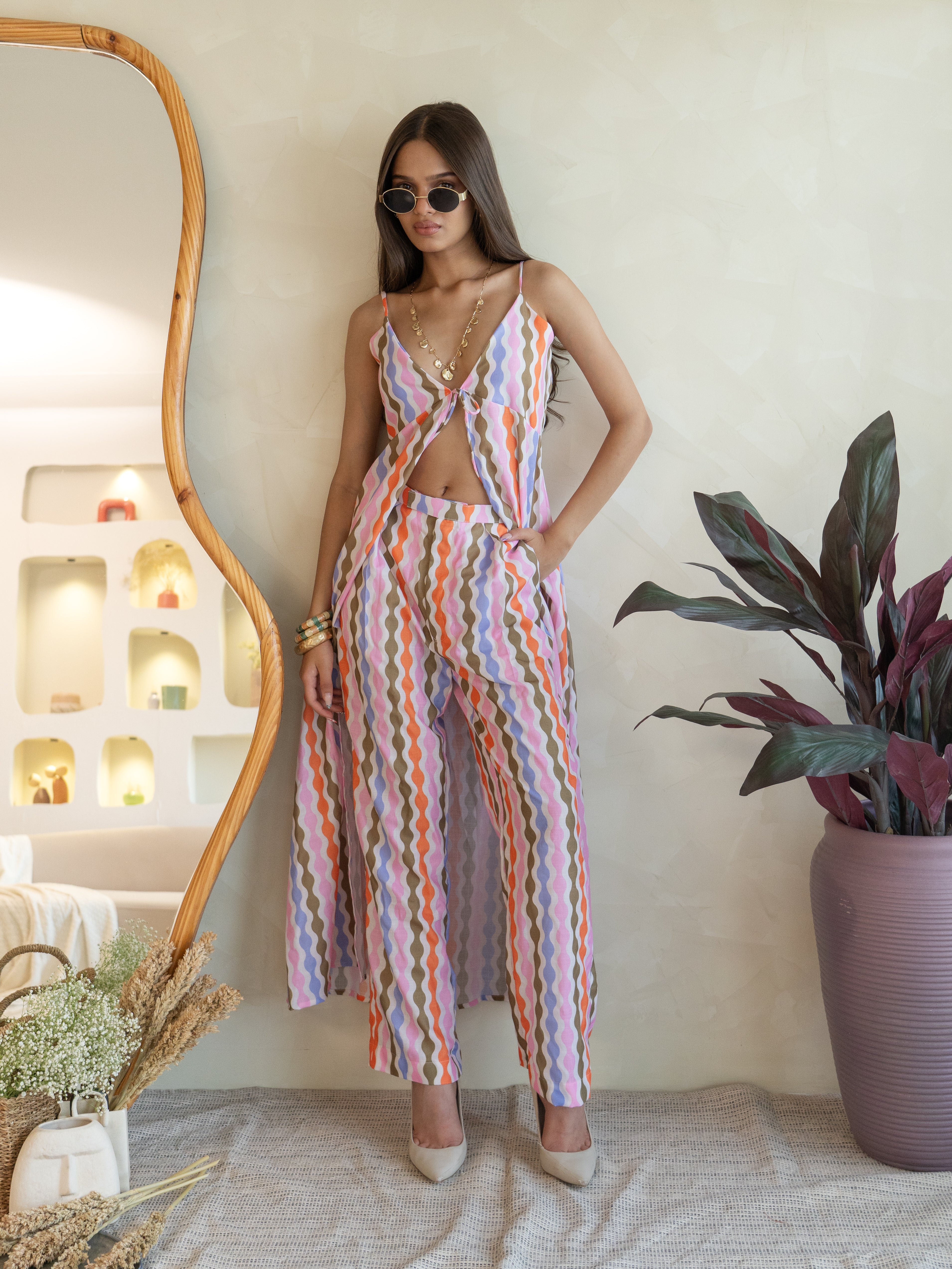 A bold and unapologetically sexy co-ord featuring a calf-length strappy top with a daring center slit and a single tie at the bust—sleek, sultry, and full of power. Paired with matching pants, the set is printed in striking geometric lines in shades of orange, brown, nude pink, and a pop of quirky green. It’s giving boss babe energy with a side of fearless fashion.